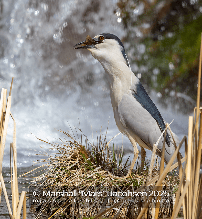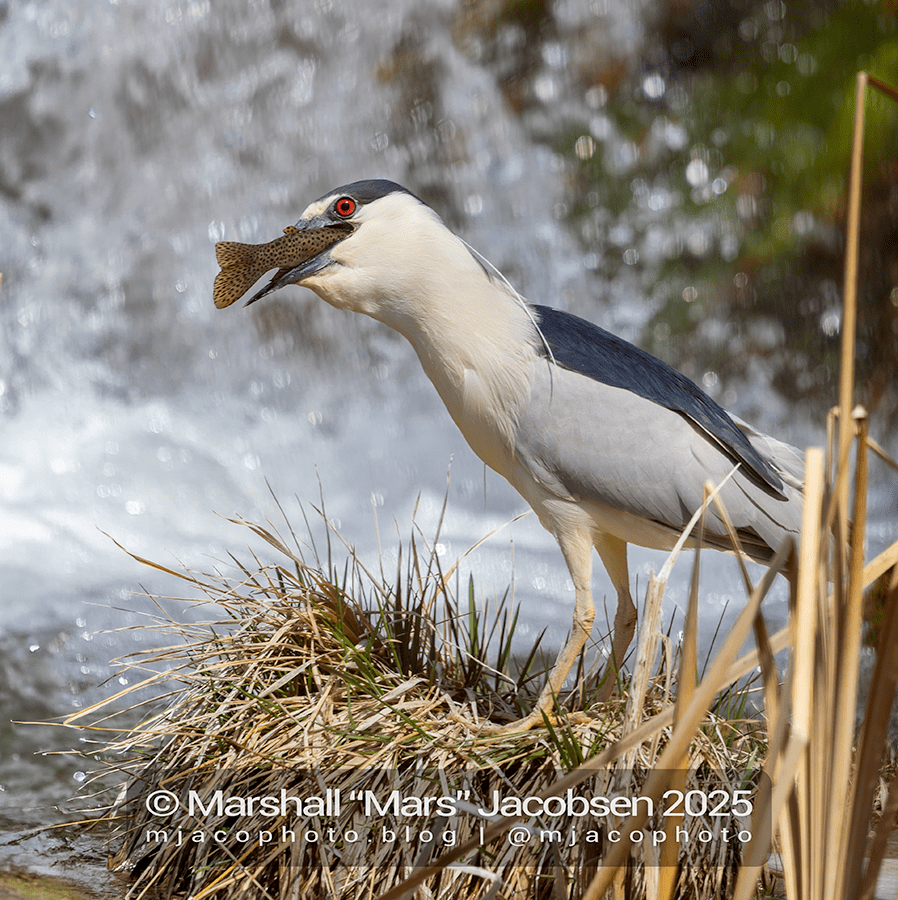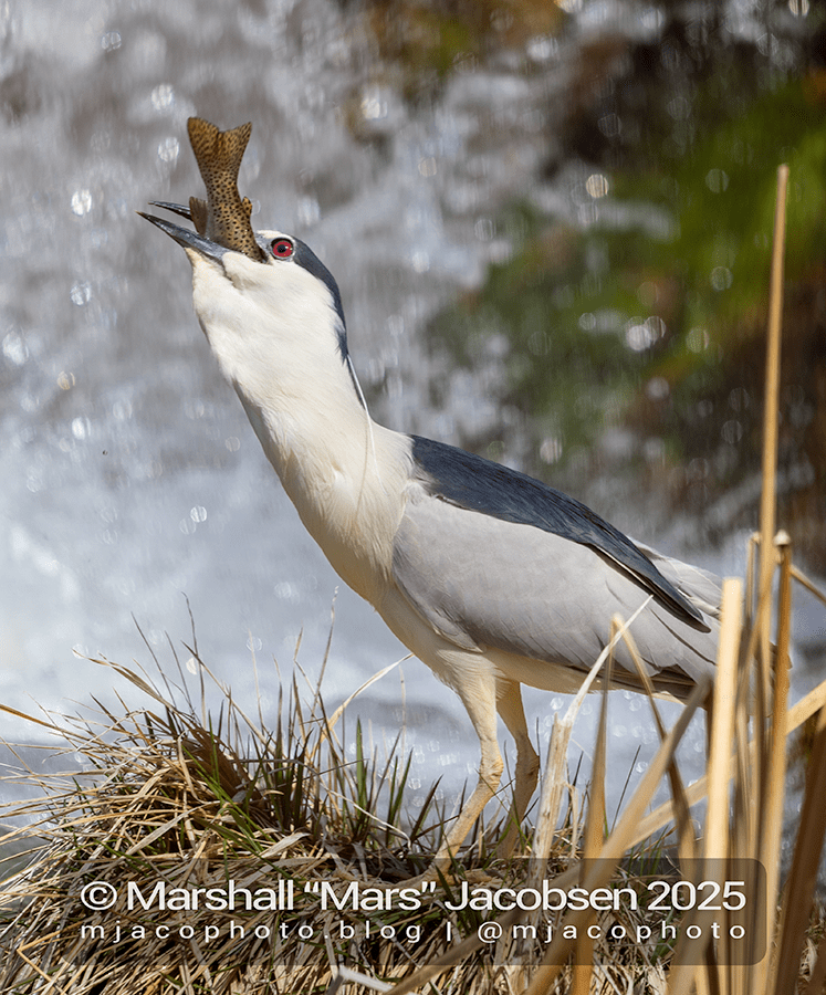 Nycticorax nycticorax consuming Oncorhynchus virginalis
